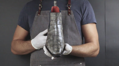Unsere handgefertigten Chelsea Boots sind ein zeitloser Klassiker mit traditioneller Goodyear-Rahmennaht und aus Kalbsleder mit Krokoprägung und marineblauen Gummizügen. Diese Stiefel haben eine exklusive Krokodilleder-Patina, eine hellgraue Veredelungstechnik, die von unseren erfahrenen Handwerkern angewendet wird. Die hochwertige schwarze Ledersohle mit Fiddle-Waist-Sohle verfügt über eine Metallkappe an der Spitze, die Stil und Haltbarkeit verleiht. Lassen Sie sich diese exklusive und stilvolle Ergänzung Ihrer Schuhsammlung nicht entgehen.