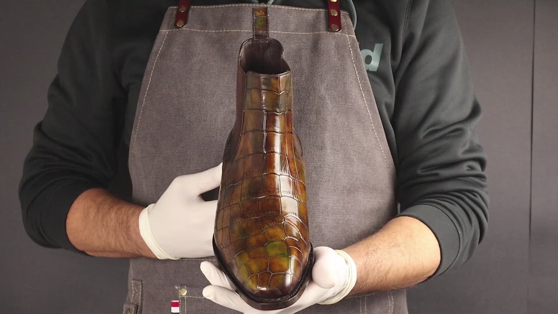 The Chelsea boot has been a classic for years. Original Goodyear welted and hand made by artisans, these boots are made from croco printed crust calf and brown elastics. The crust is hand painted and finished by our maestro colorist. It features the Croc Cairo patina, which is applied by hand, using natural oils and dyes.