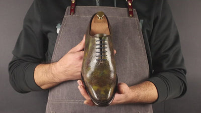 Goodyear welted pair of wholecut shoes, featuring a floral inspired pattern, which is laser engraved on the crust calf leather. The crust is hand painted and finished by our maestro colorist. It features the astonishing green museum patina, which is applied in round motions with brushes and sponges for a unique effect. The pair features a brown leather outsole and brown full-calf inner lining. In terms of construction, they are made using the Savile shoe last: a soft chisel toe and a long elegant vamp.