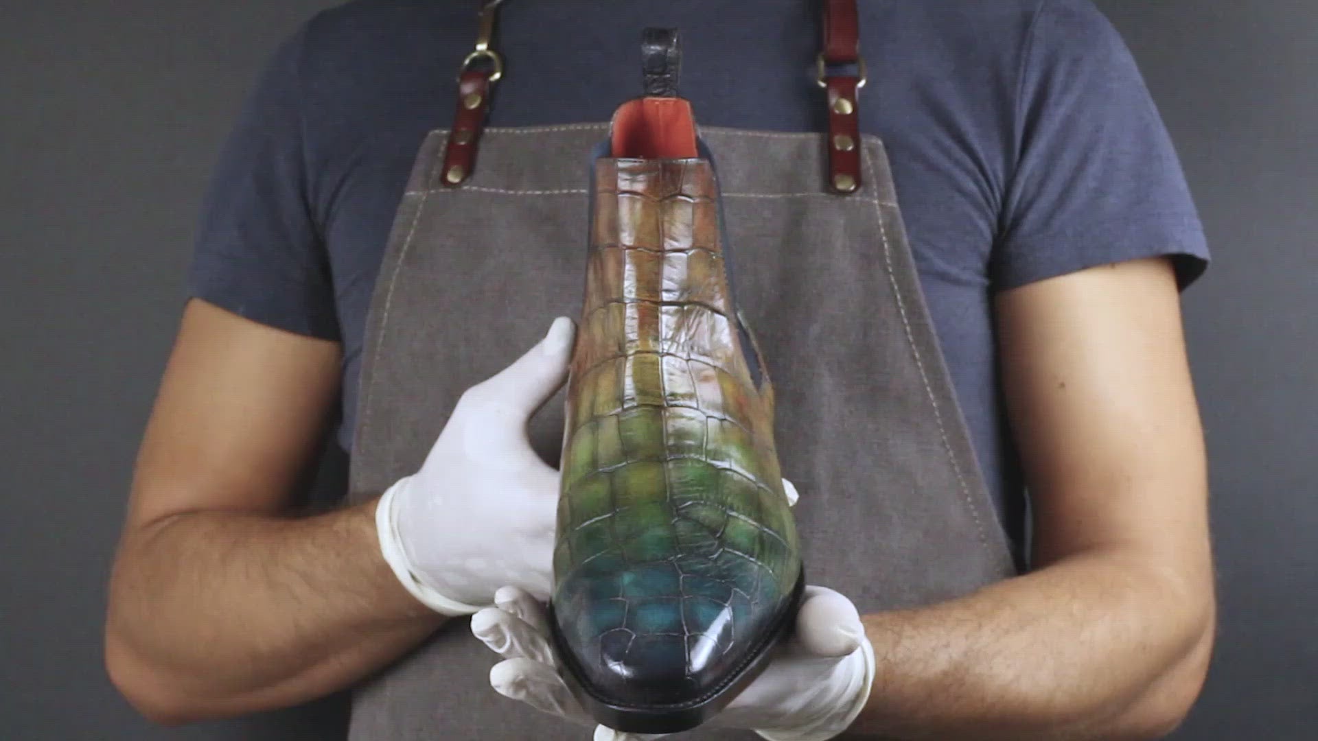 Indulge in luxury with our handcrafted Chelsea boots made using traditional Goodyear welting techniques. Our master artisans have created these classic boots using multi-color patina croco embossed calf leather and navy elastics, resulting in a unique and eye-catching design. The croc jungle patina in shades of green, blue, and brown ensures that these boots stand out from the crowd. The black fiddle waist Good year welt leather sole with a metal toe tap and full black calf lining provide both durability and comfort. These shoes are constructed using the Savile shoe last, known for its soft chisel toe and elegant vamp, resulting in a sleek and sophisticated silhouette. Don't miss out on this exclusive and stylish addition to your shoe collection. Trust us to provide you with the perfect combination of style, comfort, and quality with our range of handcrafted Chelsea boots.