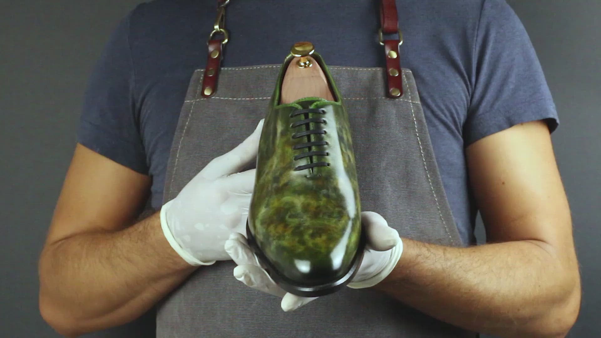 Often considered the most formal men's shoe available, the Goodyear Wholecut features closed channel lacing and is made from a single cut of leather. This limited edition is made from high grade crust calf. The leather is hand painted and finished by our artisans with the astonishing sylvan cezanne patina texture. A green base with shades of eggplant, masterfully mixed using brushes and sponges. The pair features a cognac leather outsole, and black full-calf inner lining. It’s produced using our most famous shoe last, the Zurigo last, which features a round toe for a classic english look.