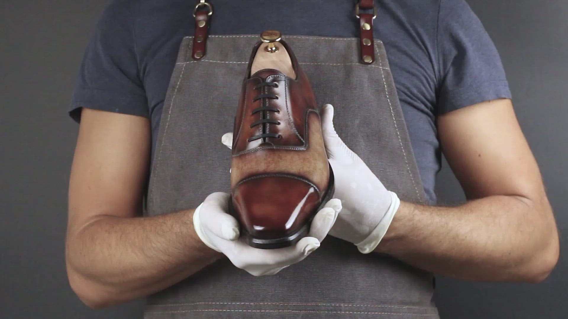 Characterized by its closed lacing style and cap toe, the oxford is an elegant, classic, timeless style suitable for any occasion. It’s handcrafted using the goodyear welt construction method. This limited edition is made from high grade crust calf, an unfinished undyed leather. The crust is hand painted and finished by our maestro colorist. It features the astonishing museum patina in cognac and cream, which is applied in round motions with brushes and sponges for a unique effect. They also feature a cognac leather sole and full black calf lined interior. This pair is produced using our Savile shoe last: a soft chisel toe and a long elegant vamp.